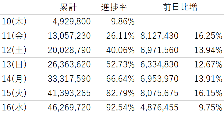 ・16(水) 46,269,720 / 92.54% / 4,876,455 (9.75%)