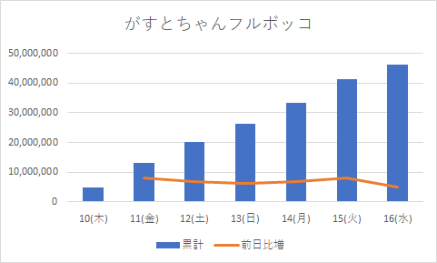 6日目には4000万を達成、1日で16.15%という2日目に次ぐハイペースが出たものの、