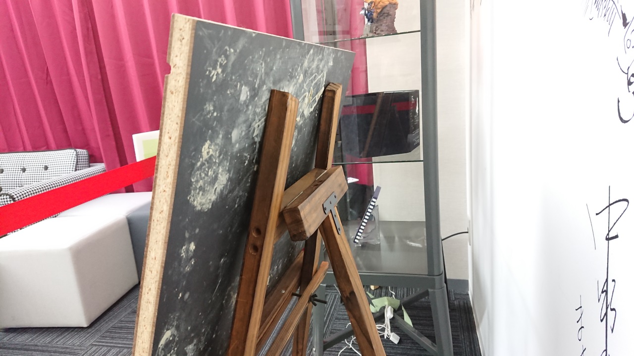四隅の凹み、絵を描くには適さない厚みなど不自然な点がありますが、どうもテレビ台から板を外したものに描かれている模様。