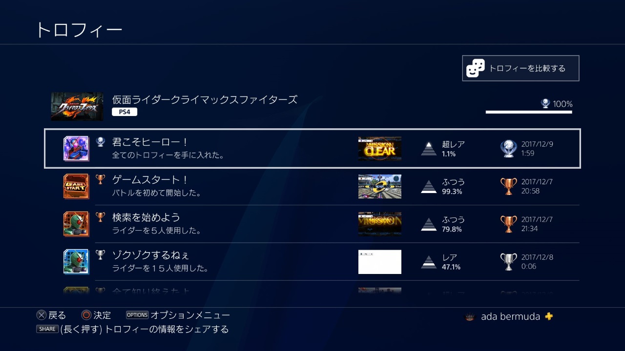 購入3日目、12月9日土曜日に日付が変わって間もなく。推定プレイ時間:9時間前後でトロフィーコンプリート(トロコン)。