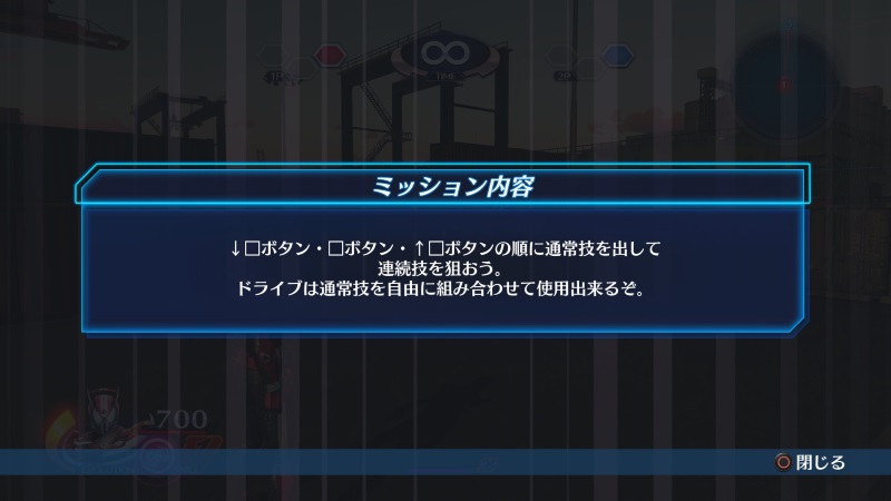 キャラクターごとのチュートリアルミッションのうち、ドライブのチュートリアル